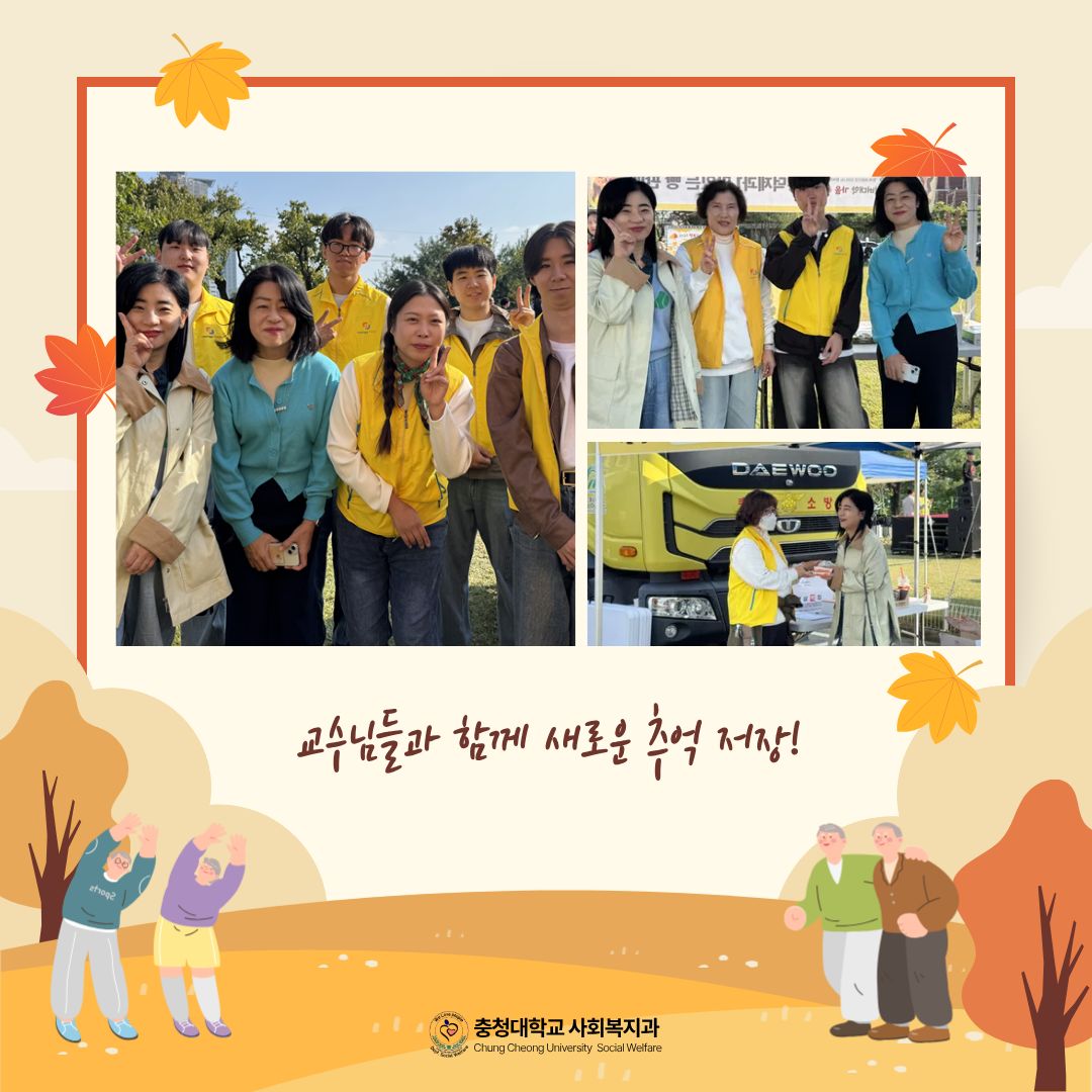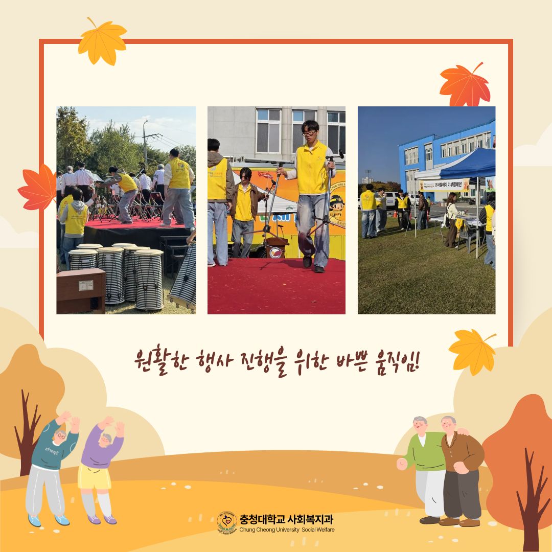 지난 수요일 충청북도노인종합복지관에서 진행하는 행복실버대학 가을 축제 보조 봉사를 다녀왔습니다! 원활한 행사 진행을 위해 무대 세팅, 어르신 응대 등 바쁘게 움직였습니다! 현장에 계신 사회복지사님의 주도에 따라 움직이며 복지관 행사에 대한 전체적인 부분을 볼 수 있는 기회였던 것 같습니다 귀한 공강 시간에 봉사를 하며 뜻 깊은 시간을 가진 것에 칭찬의 말을 끝으로 항상 응원하겠습니다~! |