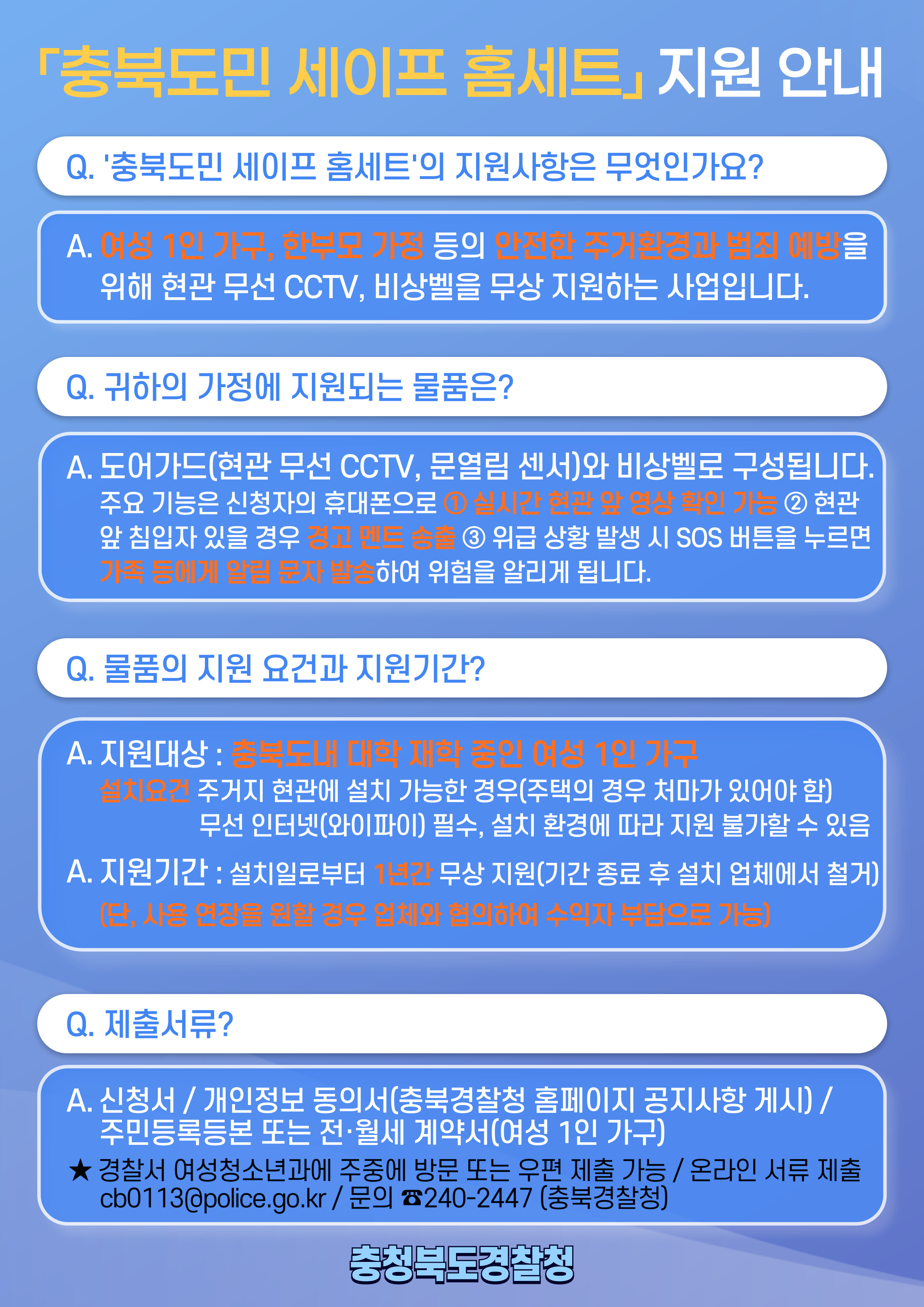 일반공지 학생공지 일반공지 장학/학자금 공지 감염병안내 공모/모집/시험 도서관 생활관 기부금공개 업무추진비공개 보육교원연수원 기타공고 충청대학교_대표-학생공지(대표_충청마당_공지사항_학생공지) 상세보기 - 제목, 내용, 파일, 작성자, 조회수, 작성일, 학과공지, 주소링크 정보 제공 [인권센터] 대학생 여성 1인 가구 대상 보안장비 무상지원 안내 작성자 : 이정민 작성일 : 2025-10-24 조회 : 79 도내 대학 재학 중인 여성 1인 가구 대상, 세이프안심홈세트 지원 안내입니다. 파일 jpg 문서 안심장비 세이프 홈세트 지원 안내문.jpg hwp 문서 서비스 이용 신청서 및 개인정보 수집이용 동의서(공통 ).hwp 주소링크 목록 게시물삭제 광고 반복작성 욕설 본인삭제 게시물삭제 이전글 【취업허브센터】 2025 모의면접 경진대회(11.19.(수)) 행사 안내 다음글 [노란화분] 해외 취업 사기 범죄 예방 안내